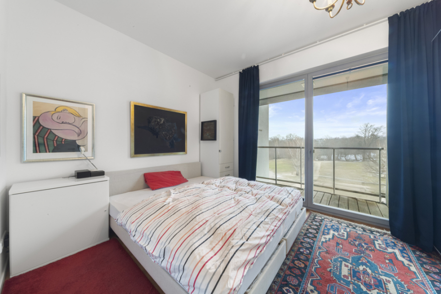 Der Schlafraum bietet Platz für einen Einbauschrank. Von der angegliederten Loggia haben sie einen weiten Blick über den ehemaligen Mauerstreifen, der als Grünanlage mit Informationstafeln gestaltet ist.
