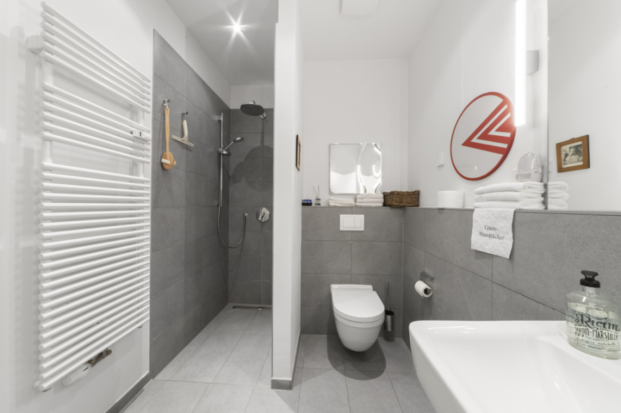 Badezimmer mit Dusche, Waschbecken, WC, Handtuchheizkörper