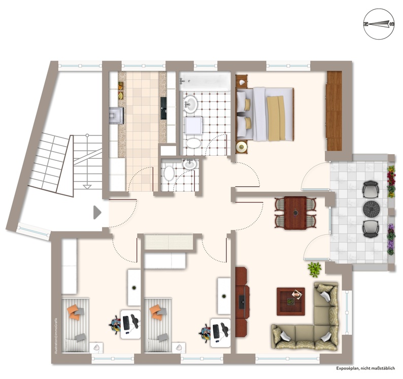 Die Wohnung wird über das Treppenhaus erschlossen. Einen Aufzug gibt es nicht. Sie unterteilt sich in Küche und Bad (jeweils mit Fenster), 3 Schlafräume und den Wohnraum. Ein großer Südbalkon ist sowohl vom Wohnzimmer als auch vom Elternschlafzimmer aus begehbar. Die Einbauküche ist mit Ausnahme des Geschirrspülers und des Kühlschranks Bestandteil der Wohnung