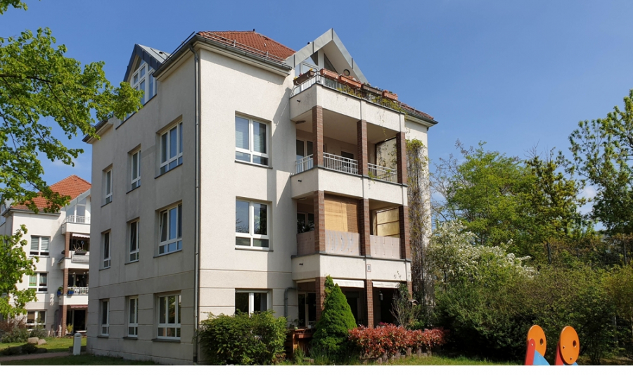Das Wohngebäude ist Teil eines Gebäudeensembles mit 92 Wohnungen und einer KITA in 6 Baukörpern. Es ist eingebettet in eine gepflegte Grünanlage.