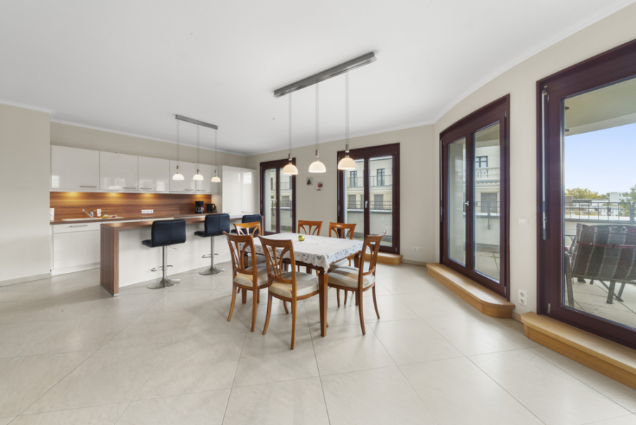 Diese nach Süden ausgerichtete Wohnung mit einer umlaufenden Terrasse liegt im sechsten Obergeschoss und ist bequem mit dem Aufzug zu erreichen. Die Wohnung mit einer Raumhöhe von mehr als 2,70 m hat einen großzügigen Wohn-Essbereich mit mehr als 60 m² Fläche. Der Wohnbereich verfügt über sechs doppelflügelige, bodentief verglaste Terrassentüren (je zwei nach Südost, nach Süd, nach Südwest). Die hochwertige Nolte- Einbauküche ist neuwertig und mit Markengeräten von Bosch ausgestattet.