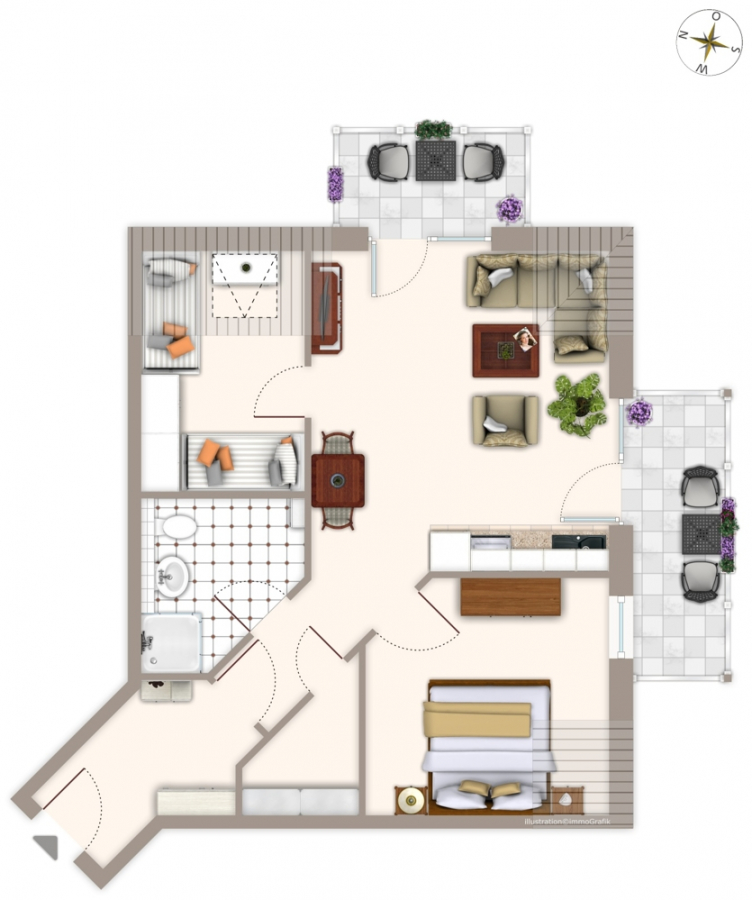 Die schönste Wohnung in dieser Ferienwohnanlage hat zwei Balkone. Der Frühstücksbalkon weist nach Osten, zum Wasser und bietet einen tollen Blick von Kap Arkona im Norden bis Kap Lohme im Südosten. Es sind nur etwa 50 m bis zur Schaabe, dem mit etwa 11 km längsten Strand Rügens. Auf dem Südbalkon kann auch außerhalb der Saison Sonne getankt werden. Die Wohnung hat zwei Schlafzimmer, eines mit Zugang zum Südbalkon, ein Duschbad und ein Wohnzimmer mit offener Küche. Dazu kommt noch ein Abstellraum und ein Windfang. Von der Verwaltung wird ein Außenstellplatz zugewiesen. Einen Kellerraum gibt es noch obendrauf.